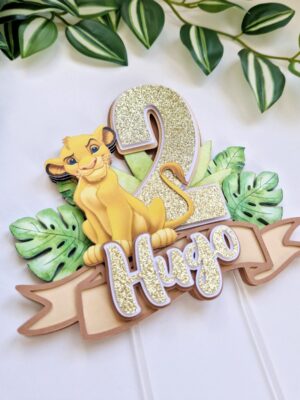 Lõvikuningas Simba ja džungli teemaline koogitopper. Topper on mahedates pruunides-beezides-rohelistes toonides – taust ja tagumine külg on helepruun, keskmine kiht beez ning kiri ja number kuldsest glitterkartongist. Kaunistuseks on lisatud ka rohelised lehekesed taustal.