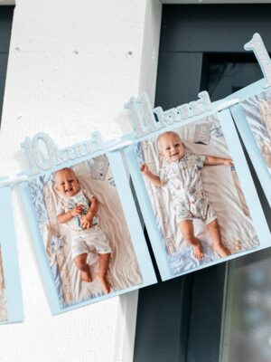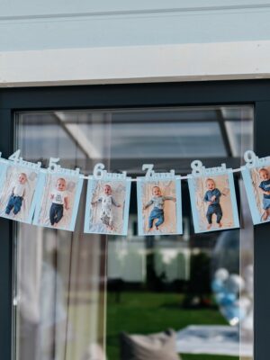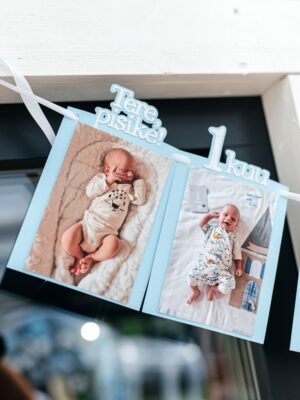 Lapse esimese eluaasta arengu jäädvustamise ehk 12 kuu fotobänner – tore täiendus lapse 1. eluaasta sünnipäevapeole. Bännerile ehk lipuketile kinnitatakse lapse fotod kuude kaupa, et kõikidel külalistel ja pereliikmetel oleks tore vaadata, kuidas laps arenes ja kasvas kuust-kuuse. Fotobänneri lipukeste ja teksti värvi on võimalik valida endale meelepärases toonis. Originaalis on bänneril 12 lipukest ehk 1 kuu, 2 kuud, 3 kuud jne kuni 11 kuud ja viimane on 1 a. Soovi korral on võimalik lisada esimeseks lipukeseks “Tere, pisike!”, kuhu saab kleepida näiteks sünnitusmajas tehtud pilt või esimene pilt koju saabudes. Samuti on võimalik lisada temaatilisi kaunistusi otsalipukestele (vikerkaar, tähekesed, auto, liblikas jne).