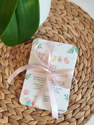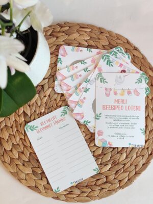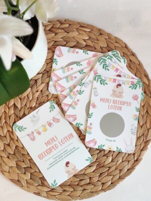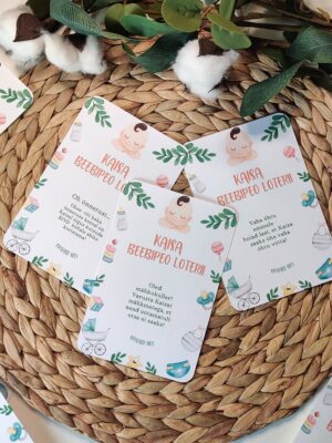 Spetsiaalselt beebipeo tähistamiseks loodud loteriitüüpi kaardikomplekt toredaks ajaveetmiseks ja üllatuseks külalistele! Komplekt toimib nagu loterii – iga külaline valib pimesi ühe kaardi, teadmata milline tegevus seal peitub. Kraapides ringikest, leiab iga külaline ülesande, kuidas ta saab tulevast ema aitada pärast pisibeebi sündi. Öeldakse ju – “It takes a village to raise a child” – vahvad ülesanded on abiks tulevasele emmele ning annavad võimaluse emmel ja sõbrannadel koos aega veeta ka pärast beebi sündi!