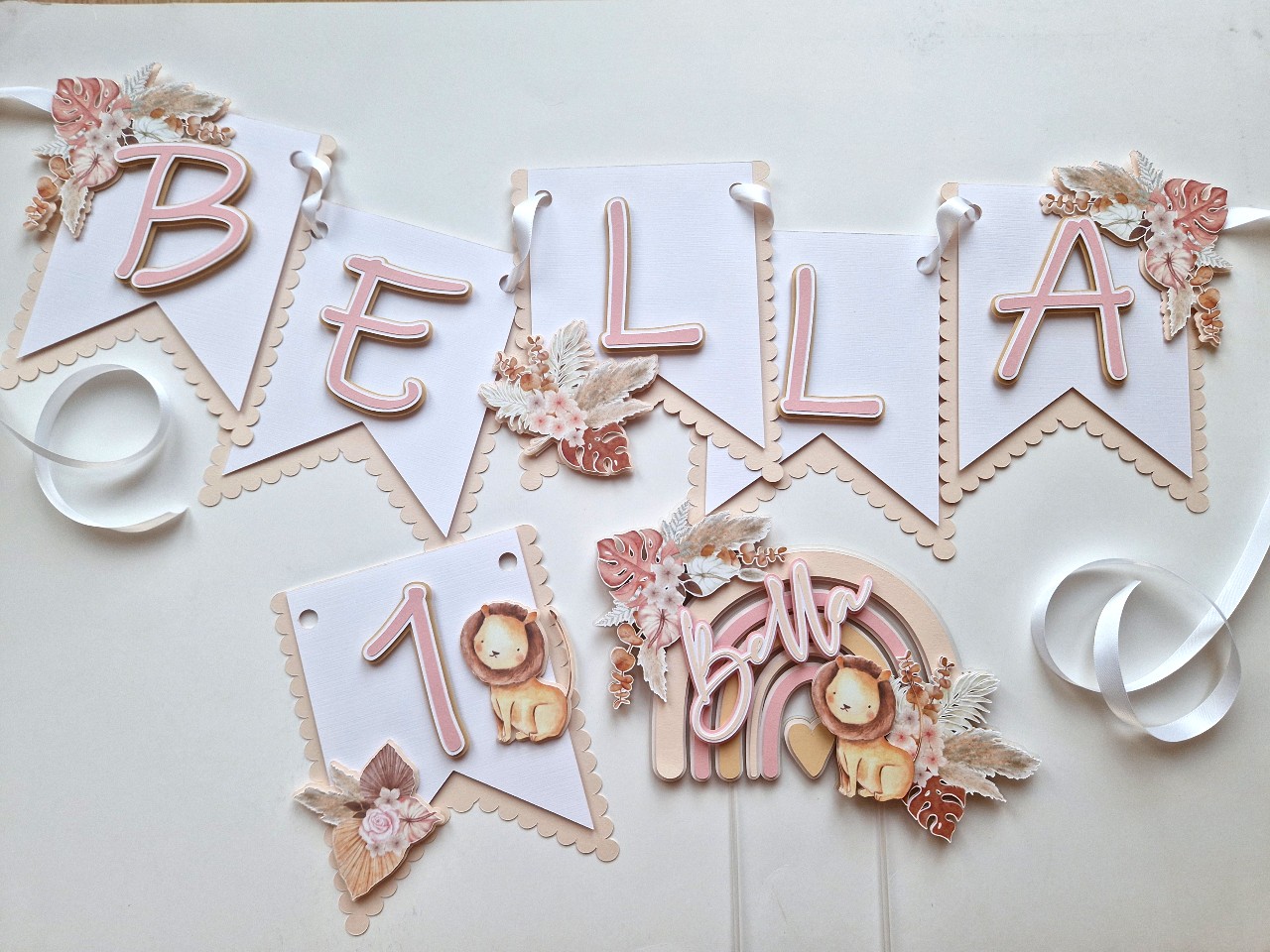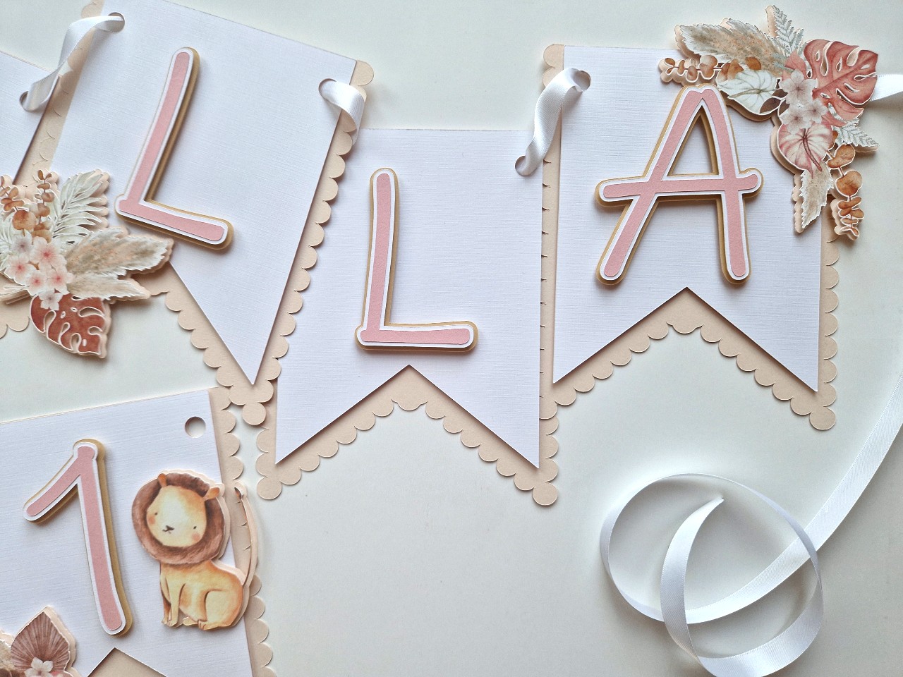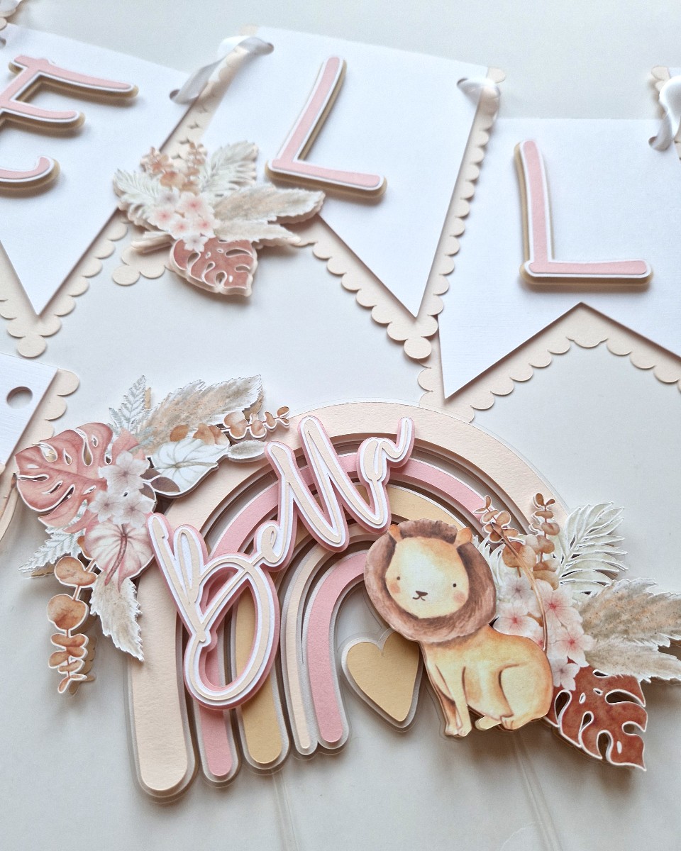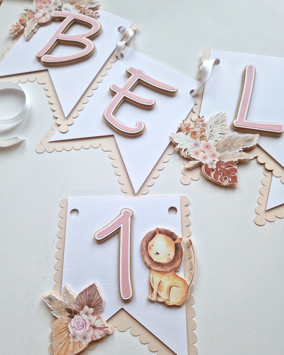 Lipukesed on meisterdatud valgest ja beežist kartongis. Nimetähed on kolmekihilised ehk heleroosa+valge+beež kartong. Bänneril on kasutatud matte, mitte-sädelevaid kartonge. Soovi korral on värvetoone võimalik vahetada – näiteks poisilikumaks saab bännerit muuta, kui teha tähed pruunid või helesinised. Samuti on võimalik vahetada lõvi pilt mõne teise looma pildiga või üldse ära jätta (oma soovidest palun anna teada kommentaaride lahtrisse). Bänner on loodud sobimaks kokku Boho-vikerkaare koogitopperiga.