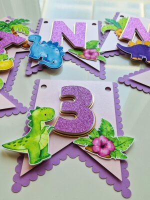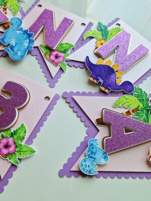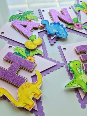 Armsate dinode ja palmidega kaunistatud suvehõnguline bänner pisikesele dinosauruste fännile! Iga lipuke on kaunistatud ühe dinosauruse ja palmilehtede või palmipuu illustratsiooniga, lipukesed on klassikalise kuju ja sakilise äärega. Bänneri toonid on vaikimisi lilla+õrnroosa (lipuke), lilla glitter+valge+peegelkuldne (tähed). Vaikimisi valmib bänner ühe reana (nt kui on koos vanuse numbriga).