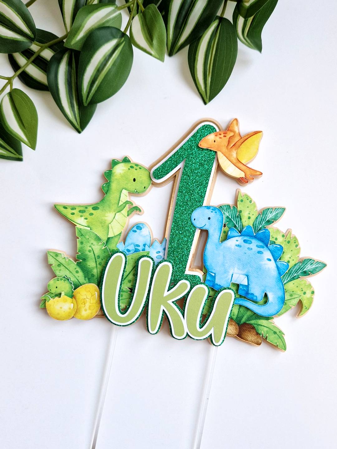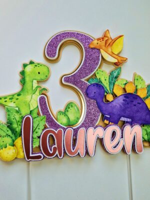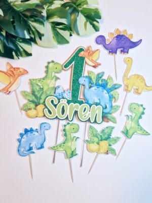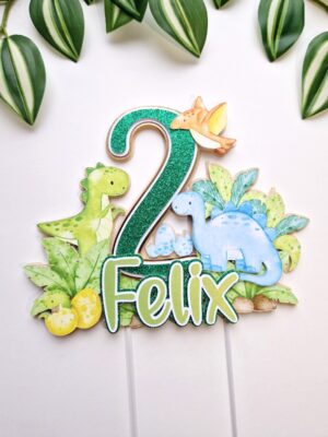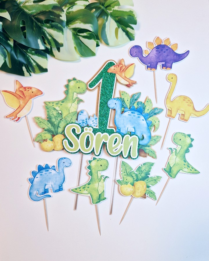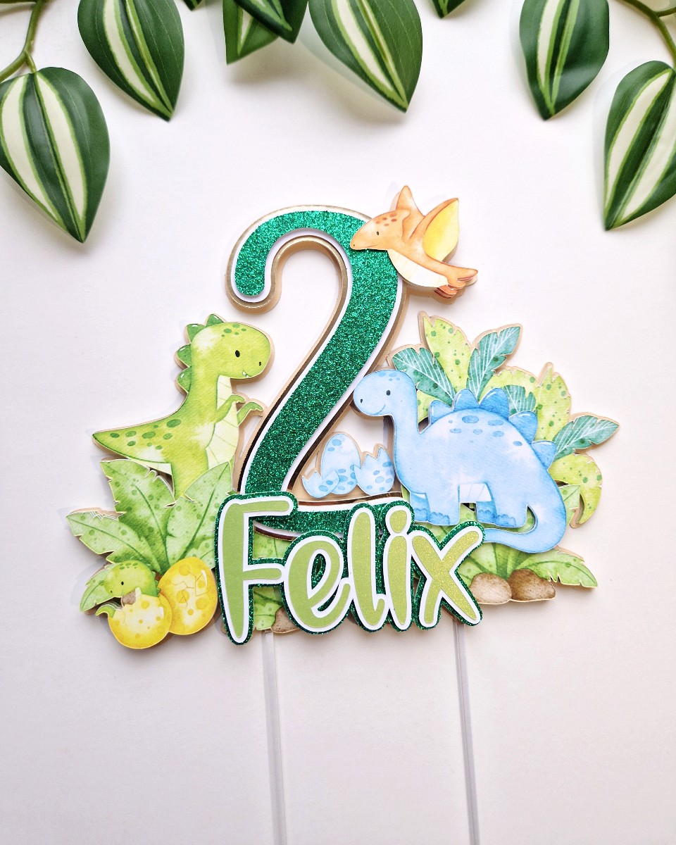 Üks vahva koogitopper pisikestele dino ehk dinosauruste fännidele. Topperil on kujutatud kolm dinosaurust ning üks pisike koorub just munast. Topperile annavad särtsu ja värvi ka džunglitaimed. Topperi taust on beežikas, number koosneb rohelisest glitterist, valgest ja kuldsest peegelkartongist. Nimi koosneb läikega helerohelisest, valgest ja rohelisest glitterist.