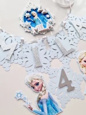 Frozeni multikast inspireeritud bänner kahe printsessi Elsa ja Annaga! Bänneri lipukesed on talvevõlumaale iseloomulike lumehelveste kujulised. Bänneri toone on võimalik valida kahe variandi vahel: sinine sädelusega lipuke ning glitter valged tähed, helesinine lipuke ning glitter hõbedad tähed. Bänneri kummaski otsa on võimalik lisada kas Elsa ja Anna pildiga otsalipud või ainult Elsa pildiga otsalipud – need seovad koos temaatilise kirjastiili ja värvidega bänneri teema üheks. Vaikimisi valmib bänner ühe reana, aga soovi korral on võimalik teha ka kaherealisena.