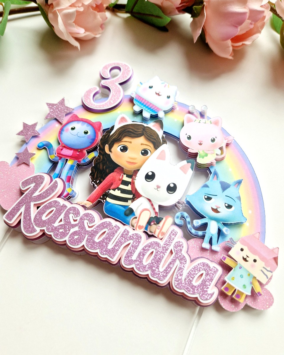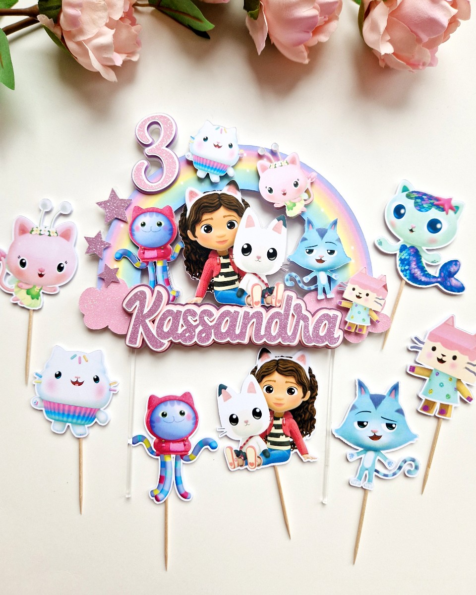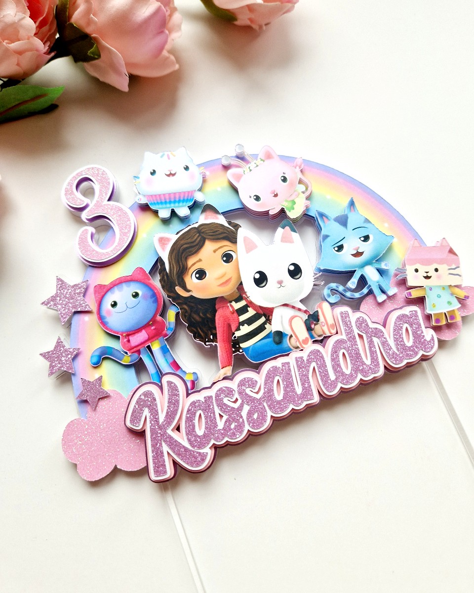 Topperil on kujutatud Gabbyt, tema kiisusid, sädelevaid tähekesi ning vikerkaart, mis sümboliseerib rõõmu ja fantaasiat. Nimi on meisterdatud glitter helelillast, millele järgneb valge kiht, siis roosa kiht ning viimaseks kihiks on satiin helelilla. Gabby’s Dollhouse koogitopper sobib ideaalselt sünnipäevatordi kaunistamiseks, mis hiljem jääb ka mälestuseks või lapsetoa aksessuaariks. Lastele meeldib näha oma nime koos lemmiktegelastega – see muudab nende pidupäeva tõeliselt maagiliseks.