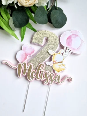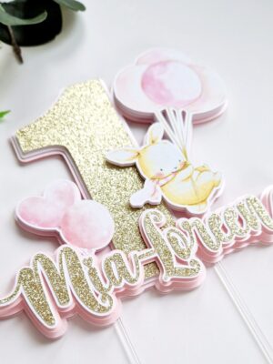 Vahva jänkuga ja õhupallidega koogitopper pisitüdruku esimeseks sünnipäevaks. Topperil on kujutatud üks lõbus jänkutüdruk, kes lendab roosade õhupallidega, endal sall lehvimas. Topperi keskel on uhke suur glitterkuldne number 1, millele järgneb veel valge ja heleroosa kiht. Lapse nimi on samuti tehtud glitterkuldsest kartongist, koos valge ja virsikuroosa kihiga. Lapse nime esimesele ja viimasele tähele on lisatud nunnud paunadega erikujud. Kogu topperi põhi on heleroosa.