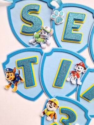 Bänneril on kujutatud kõik tuntud tegelased – Chase, Marshall, Skye, Rubble, Rocky, Zuma ja Everest. Lipukesed on meisterdatud helesinisest kartongist, millele on lisatud sinine äär. Nimele aga lisab pidulikkust luksuslik helesinine glitter, millele järgneb sinise ning kollase kartongi kiht. Värvitoonide poolest sobitub bänner ideaalselt meie Käpapatrulli koogitopperi värvitoonidega ning soovi korral on võimalik meisterdada bänner ka tüdruku toonides (heleroosa lipuke tumedama roosa äärega, nimi pealt roosa glitter + heleroosa + tumedam roosa) .