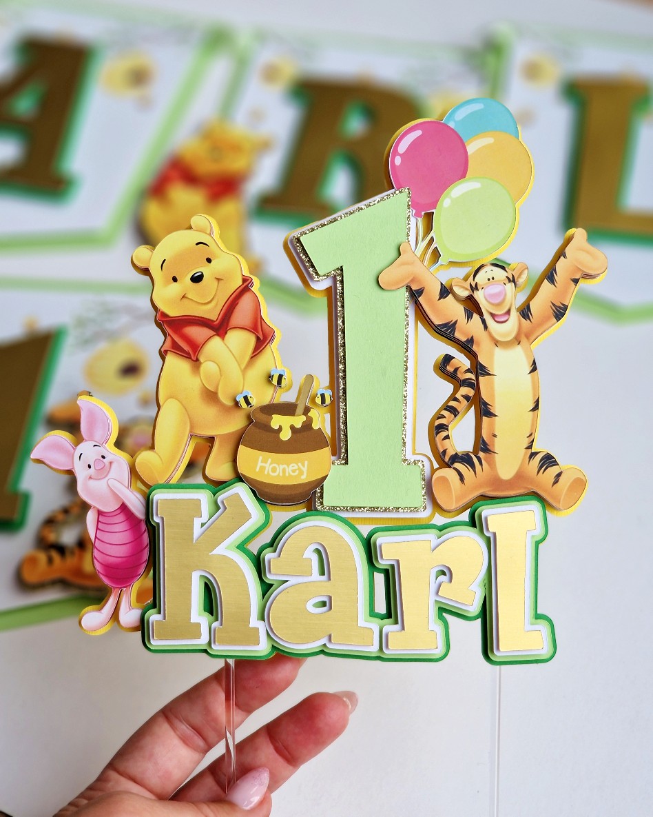 Karupoeg Puhhi koogitopper on ideaalne kaunistus lapse sünnipäevatordile, tuues armsa ja mängulise meeleolu otse peolauale. Topperil on kujutatud kõikide lemmikud – Karupoeg Puhh oma meepotiga, rõõmsameelne Notsu, energiline Tiiger ning värvilised õhupallid, mis loovad piduliku tunde. See kaunis detail paneb lapse sünnipäevatordi särama ja jääb kindlasti kaunilt meelde nii sünnipäevalapsele kui ka külalistele. Värvid on rõõmsad ja lapsemeelsed, sobides ideaalselt laste sünnipäeva teemadega – heleroheline, roheline, kuldne ja kollane. Lisaks saab topperile lisada lapse nime ja vanuse, mis muudab selle veelgi personaalsemaks ja erilisemaks.