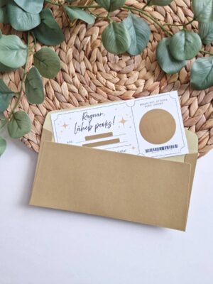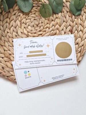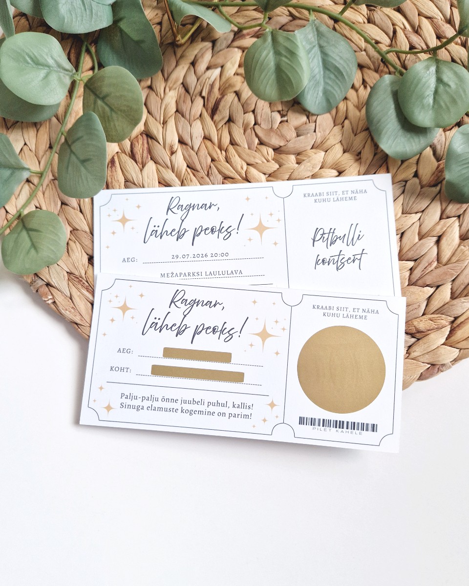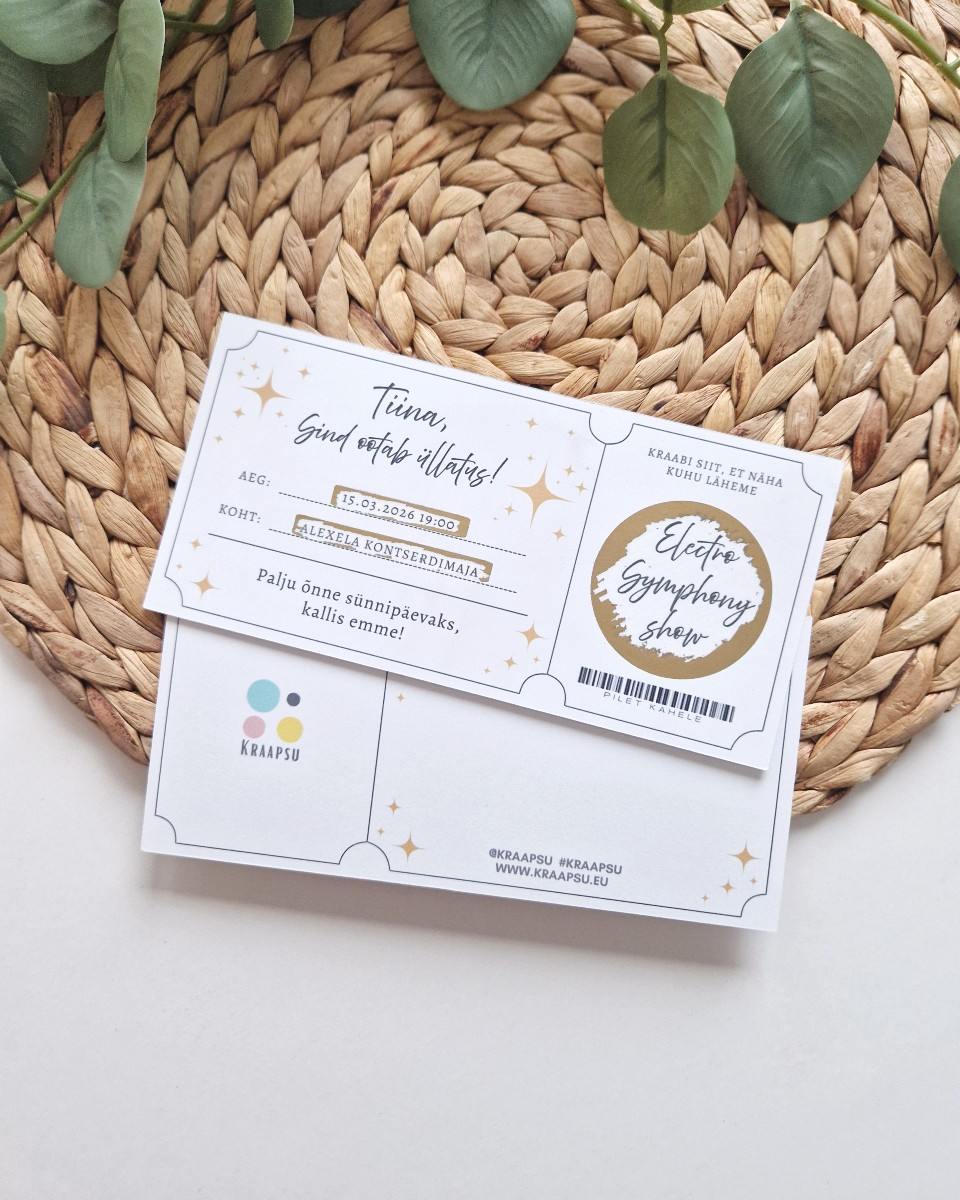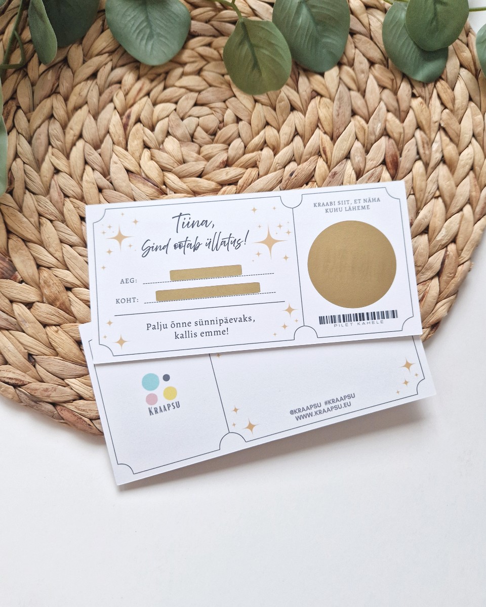 Soovid kinkida elamust, mitte lihtsalt eset? Kraabitav Kinkepilet on originaalne ja emotsioone tekitav viis kontserdi-, teatri- või muu erilise elamuse kinkimiseks. Tegemist on personaalse kraabitava kaardiga, mille kuldsete kraabitavate pindade all peitub sinu valitud üllatus – kuupäev, koht ning etendus või sündmus, kuhu koos minnakse. Kingisaaja saab kraapides avastada, mis teda ees ootab, muutes kingi avamise põnevaks ja meeldejäävaks hetkeks. Kraabitav Kinkepilet sobib suurepäraselt sünnipäevaks, jõuludeks, aastapäevaks või romantiliseks üllatuseks.