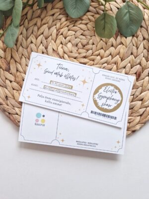 Kaart on stiilselt kujundatud ning pakendatud elegantsesse metallikläikega kuldsesse ümbrikusse, mis annab kingitusele luksusliku ja läbimõeldud ilme. Kaart on prinditud kõrge kvaliteediga 250gsm paksule paberile ja on suurusega 9cm x 18cm.