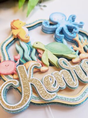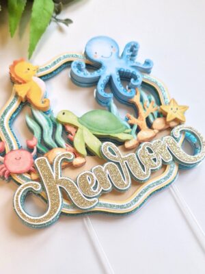 Mereteemaline topper on lummav tordikaunistus, mis viib sünnipäevapeo otse suvise ranna meeleollu! Topperil on kujutatud armas kilpkonn, merihobu, krabi, meritäht ja kaheksajalg ning muidugi ei puudu ka kujutised lainetest ja liivast – täiuslik kombinatsioon mereelust ja puhkuse atmosfäärist. Nimi on meisterdatud kuldsest glitterist, millele järgneb valge kiht ning münditooni glitter. Lainete kujutisega taust on meisterdatud türkiissinisest glitterist, kuldse sädelusega kartongist ning münditooni glitterist. See topper lisab igale tordile või koogile värsket mere stiili ning sobib suurepäraselt sünnipäevadeks, suvepidudeks või teemaüritusteks.