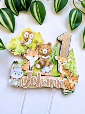 Armsate metsloomadega koogitopper lisab igale peole metsamaagiat ja võlu! Metsloomade topper sobib ideaalselt nii loomasõbrast poisi kui tüdruku sünnipäeva kaunistama – kujundusest on kaks varianti, üks on poisile ning teine kohandatud tüdrukule (loomakestel on lillepärjad peas). Topperil on metsa taustal kujutatud armsaid metsloomi nagu rebane, jänku, karu, kits ja teised vahvad tegelased. Poisile mõeldud topperil on värvideks tumeroheline + beež + pronks glitter, tüdruku topperil aga beež + õrn roosa + kuldne glitter. Loomadega torditopper on suurepärane valik nii looduseteemalisele kui ka lihtsalt lõbusale ja lapselikule sünnipäevale – topper annab tordile unikaalse ja isikupärase puudutuse!
