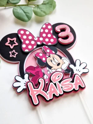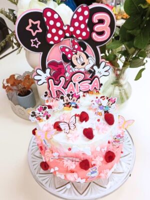 Särtsakas ja stiilne Minnie Hiire koogitopper on suurepärane valik ühe väikse preili sünnipäevapeole! Koogitopper on kujundatud klassikalistes roosakas-mustades toonides, tuues esile Minnie Hiire ikoonilise stiili. Disainis ei puudu ka armsad kõrvad, tuttav lipsuke ja Disney kirjastiil, mis muudavad topperi mänguliseks ja pilkupüüdvaks. Nimel on kasutatud heleroosat glitterit, valget, musta ja matt roosat kartongi. Topperi põhi on heleroosast kartongist, kaunistused aga roosast glitterist. Telli Minnie Hiire koogitopper juba täna ja too sünnipäevapeole lõbus Disney hõng!
