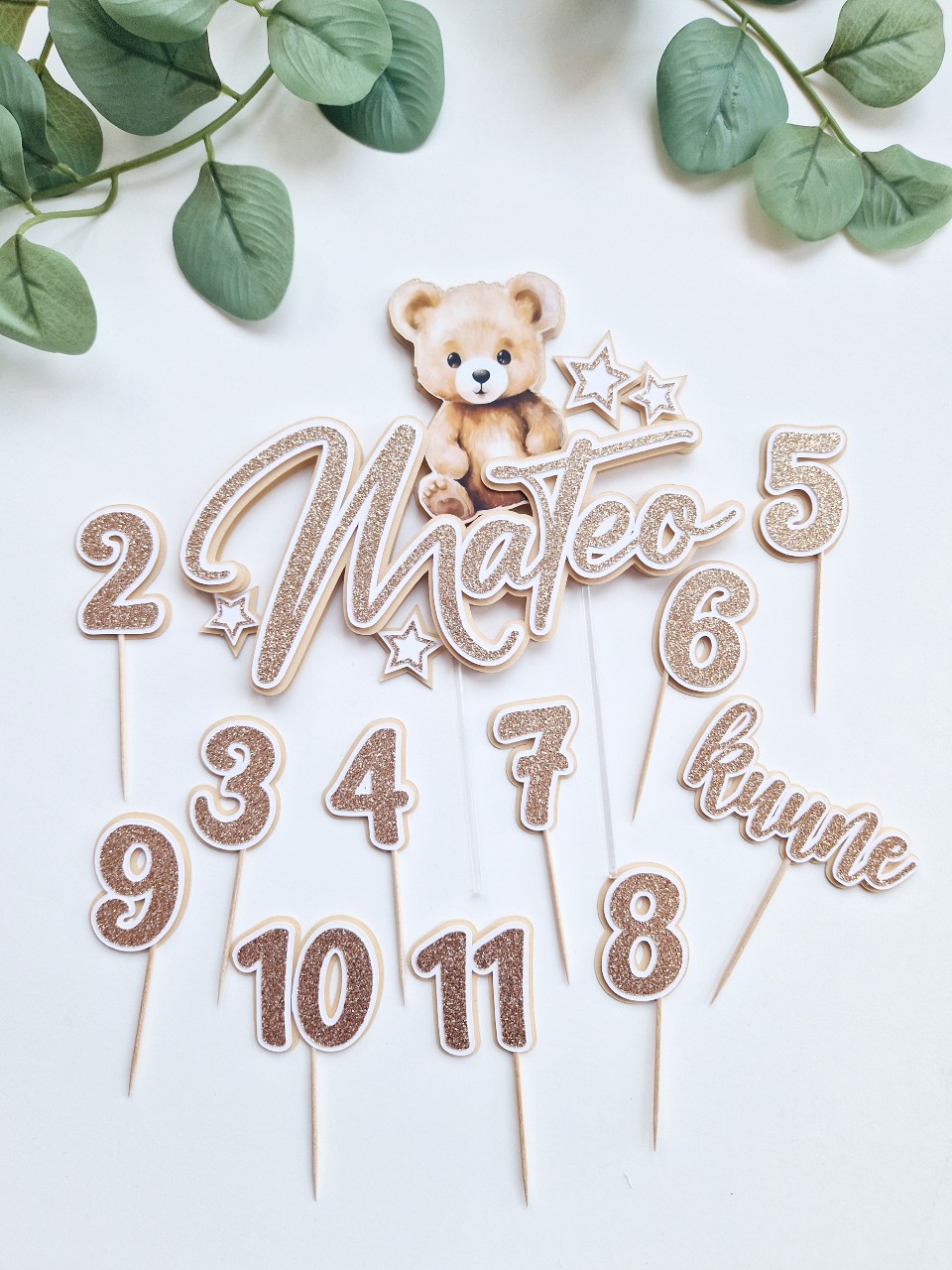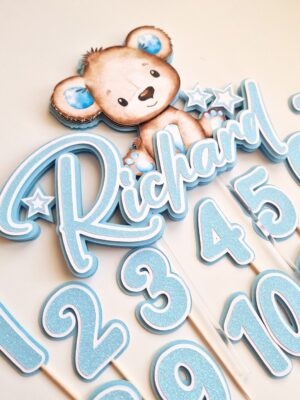 Heledates toonides ning armsa mõmmiga esimese eluaasta minisünnipäevade tähistamiseks mõeldud komplekt. Komplektis on suurem nimetopper, soovitud kuude numbritega numbritopperid ja “kuu”+”kuud” või “kuune” kirjaga minitopper. Nimetopper on kolmekihiline ja mahuline – helesinine glitter, valge ning matt helesinine kartong. Nime kaunistavad glitterist tähekesed ja armas mõmmi. Numbritopperid on kolmekihilised – helesinine glitter, valge ja matt helesinine kartong. Minisünnipäevade komplekt on ideaalne kingitus pisikesele katsikuteks või beebipeoks, kuna aitab luua ilusaid mälestusi lapse esimese eluaasta jooksul.