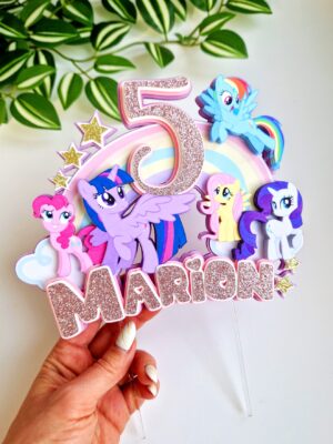 Maagiline ja särav koogitopper My Little Pony multikategelastega ja vikerkaarega. Topperil on kujutatud pastelsetes toonides vikerkaar ja pilvekesed, 5 laste seas palavalt armastatud ilusat ponit ning sädelevad detailid, mis lisavad peolauale tõelist muinasjutulist sära. My Little Pony multika tõeline fänn näeb kohe ka ära, et nimel on kasutatud My Little Pony kirjastiili. Nimi ja vanuse number on meisterdatud vanaroosast glitterist, millele järgneb valge kiht ja roosa kiht, kogu topperi põhi on aga helelilla. Kui otsid silmapaistvat ja mängulist sünnipäevapeo dekoratsiooni, mis toob naeratuse iga lapse näole, on see koogitopper just õige valik!