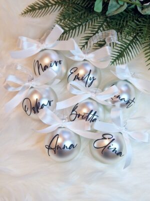 Armas nimeline jõulukuul on eriline kingitus nii endale kui lähedasele! Valikus on erinevat värvitooni mati viimistlusega jõulukuule – punane, hõbedane, pronks, must, aprikoos, roheline, samblaroheline, heleroosa ning kreemikas. Kõiki värve on piiratud koguses! Kuulidel on valge riputusaas ning soovikorral lisame kuulile ka soovitud värvi atlaspaelast lipsukese. Nime jaoks saad valida erinevate kirjastiilide ja kirjavärvide seast oma lemmikud. Kui soovid, et kasutaksime nimetähtedel erikujusid, siis lisa vastav soov kommentaaride lahtrisse.