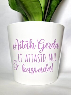 Lase oma loomingulisus valla ja muuda tavaline lillepott eriliseks – vali ise tekst, kirjastiil, teksti värv ja kaunistuselemendid, et luua just selline lillepott, mis sobib ideaalselt koju, kontorisse või kingituseks. See on suurepärane kingiidee sünnipäevaks, emadepäevaks, sõbrapäevaks või õpetajale tänutäheks! Saad luua personaalse ja ainulaadse kingituse.