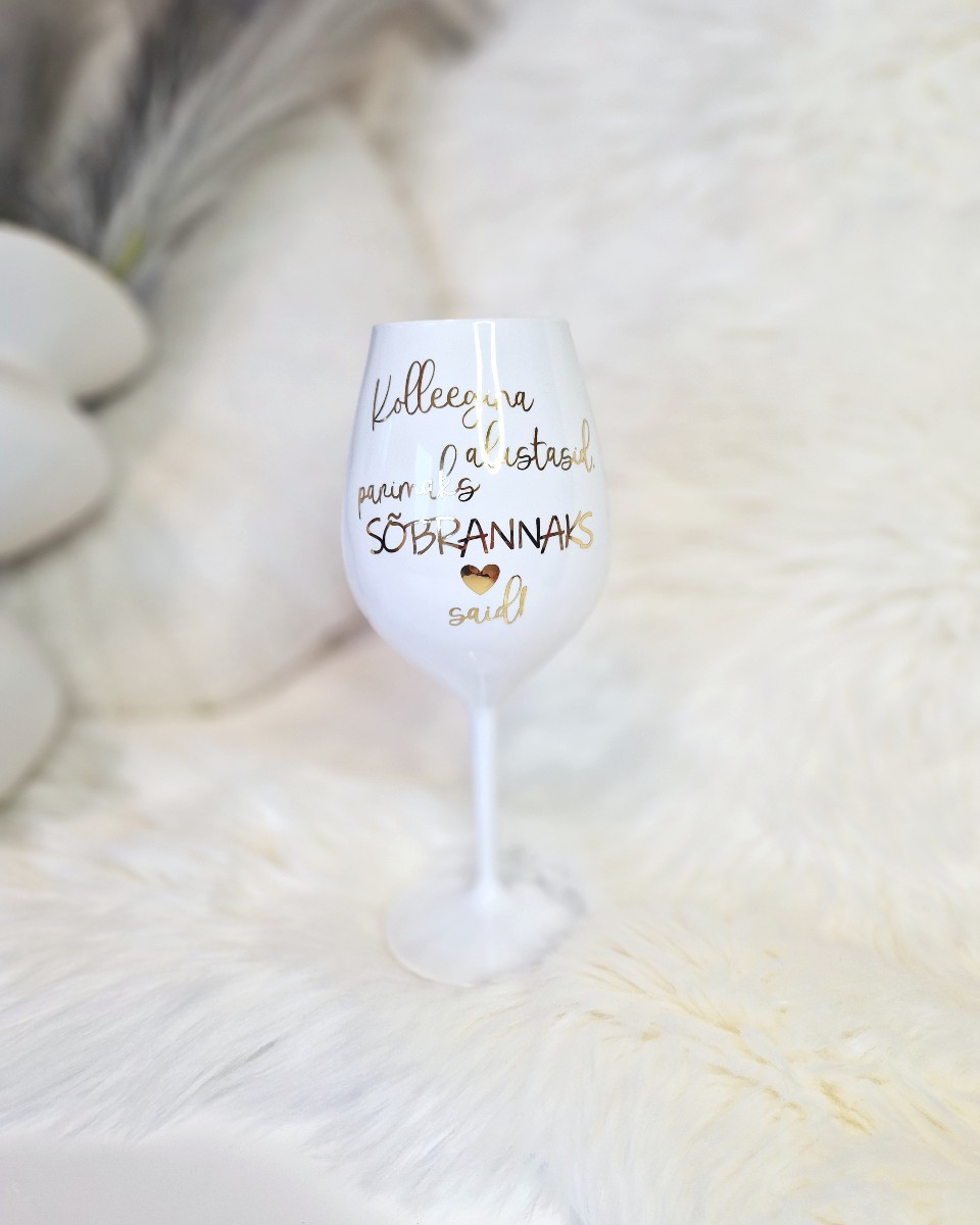 Pokaal on valmistatud purunemiskindlast, kuid kergest ja pika eluaega BPA-vabast plastikust. Veinipokaali maht on 510ml. Kirja jaoks kasutame pokaalide peal vastupidavat ja veekindlat vinüülkleebist, kuid kujunduse pikaajaliseks ja ilusaks säilimiseks soovitame käsipesu. Pokaaliga tuleb kaasa pisike hooldusjuhis.