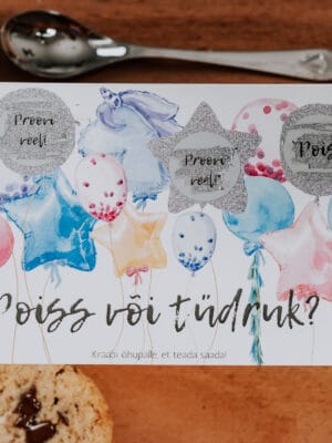 Anna perele ja lähedastele kõhubeebi soost teada huvitaval moel kraabitavate kaartidega! Vahvate õhupallide kujundusega “Poiss või tüdruk?” kaardil on kraapimist kohe rohkem – kaardil on kolm kraabitavat “õhupalli”, millest ühe alla on peidetud oodatava lapse sugu. Beebi sooteatamise kaarte saab kasutada osana sooteatamispeost (gender-reveal) või tulevaste lapsevanemate, vanavanemate ja lähedaste põnevaks üllatamiseks.