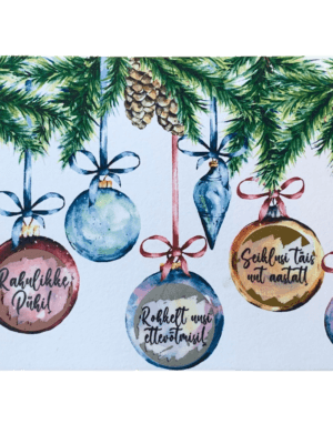 Kaardi esiküljele värviliste jõulukuulide sisse oleme peitnud kolm ilusat soovi jõuluajaks, kuid kuulide alla saad lisada ka hoopis enda soovid. Kaardi tagaküljele kirjutame Sinu soovitud pühenduse ning sõnumi, mis läheb suure südame alla samuti peitu, alla aga lisame soovija(te) nime(d).