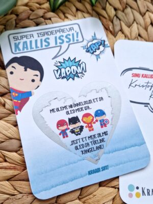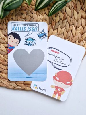 Vaikimise on Superkangelase kaardi kraabitava südame alla on peidetud tekst: “Ma olen nii õnnelik, et sa oled minu isa… …sest et minu silmis oled sa tõeline kangelane!”. Soovi korral on võimalik asendada õnnitlustekst oma soovitud tekstiga – palun kirjuta tellimuse esitamisel oma õnnitlus kommentaaride lahtrisse.