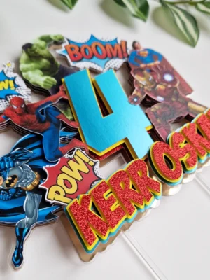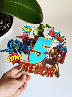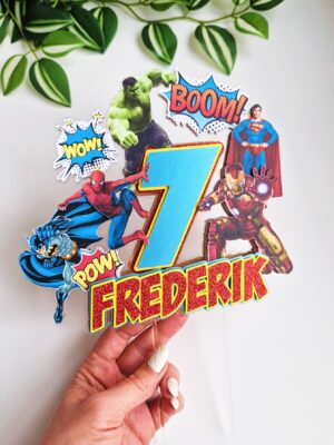 Kas Sinu peres on väike (või suur) superkangelaste fänn? 🦸♂️⚡ Siis on Superkangelaste koogitopper ideaalne täiendus sünnipäevalauale! See efektsetes toonides topper toob kokku maailma armastatuimad kangelased – Hulk, Ironman, Superman, Spiderman ja Batman. Sünnipäevalapse nime ja vanuse meisterdamisel on kasutatud punast glitterkartongi, kollast kartongi ning peegelefektiga satiinsinist kartongi. Särtsu lisamiseks on topperil ka ägedad koomiksi elemendid.
