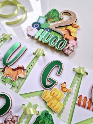 Taluloomade topper on ideaalne kaunistus lapse sünnipäevapeole, tuues tordi keskele vahva ja rõõmsa meeleolu. Koogitopperil on kujutatud armsaid taluloomi – hobust, lammast, kana, notsut ja kassi –, lisaks ka traktor, mis rõõmustab eriti masinate fänne. Kujundus on lapsemeelne ja samas pidulik, muutes iga tordi tõeliselt silmapaistvaks. Topperi toonideks on satiinroheline ja heleroheline, mis loovad värske ja kevadise mulje, ning pronks glitter, mis lisab särtsu ja pidulikkust.