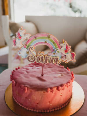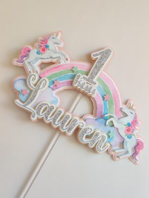 Õrn ja tütarlapselik pastelse vikerkaare ning väikeste ükssarvikutega koogitopper väikestele unistajatele! Koogitopperi taust on heleroosa ning kiri koosneb õrnkollasest, valgest ja hõbedasest glitter kartongist. Vikerkaar, ükssarvikud ja nimi on mahulised ning annavad topperile ruumilise efekti.
