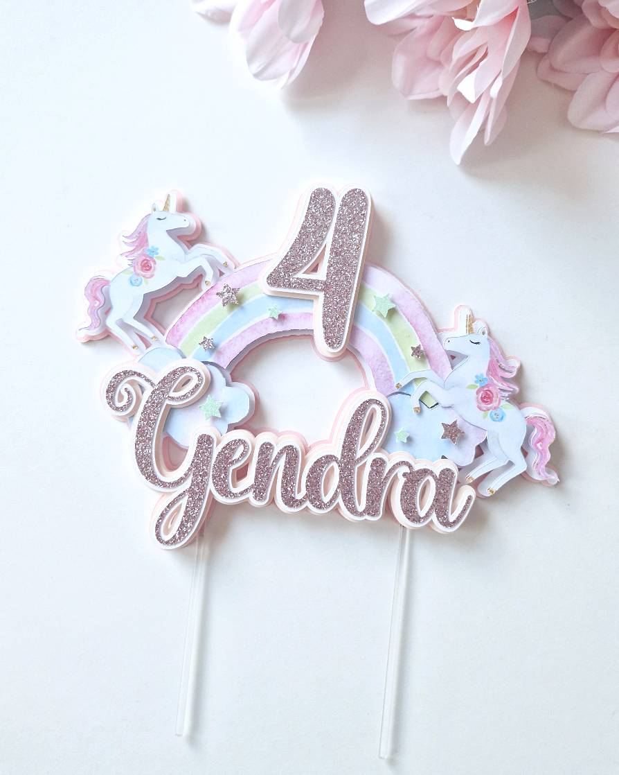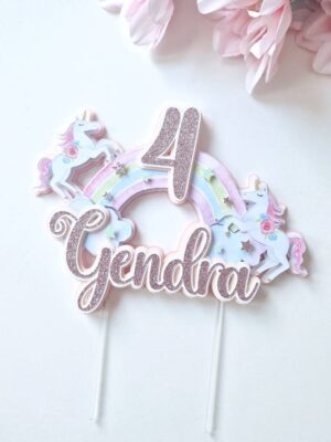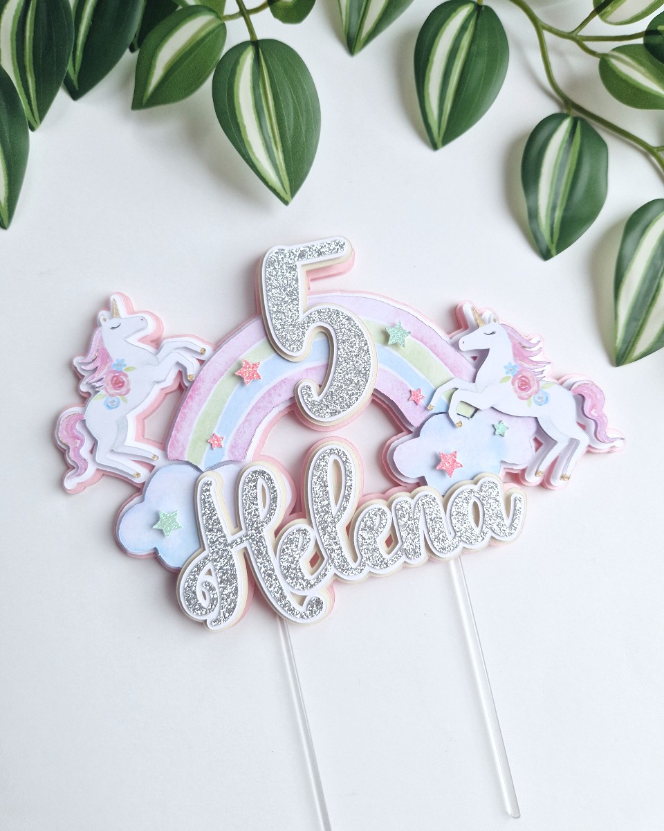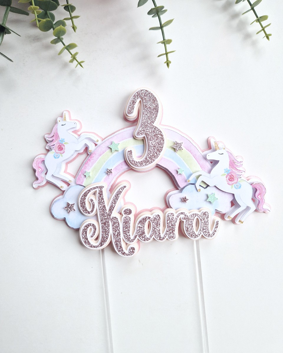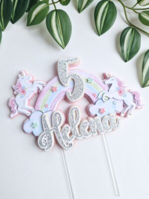 Õrn ja tütarlapselik pastelse vikerkaare ning väikeste ükssarvikutega koogitopper väikestele unistajatele! Koogitopperi taust on heleroosa ning nime jaoks saab valida kas vanaroosat või hõbedat glitterit. Vikerkaar, ükssarvikud ja nimi on mahulised ning annavad topperile ruumilise efekti. Vikerkaar on kaunistatud ka glitterist tähekestega.